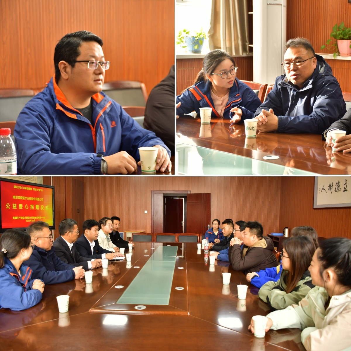 公益小組和校領(lǐng)導(dǎo)、外省援疆的老師們進行了深入的交流,詳細了解學(xué)校和當?shù)貙W(xué)生的情況。胡楊河市第一中學(xué)位于新疆建設(shè)兵團第七師胡楊河市,是江蘇省對口援疆學(xué)校,在校生1300余名,有10名省外支教的老師。近年來,因為公益組織和愛心企業(yè)的捐贈,學(xué)校的辦學(xué)條件越來越好,學(xué)生也能在更舒適的環(huán)境中努力學(xué)習(xí)。